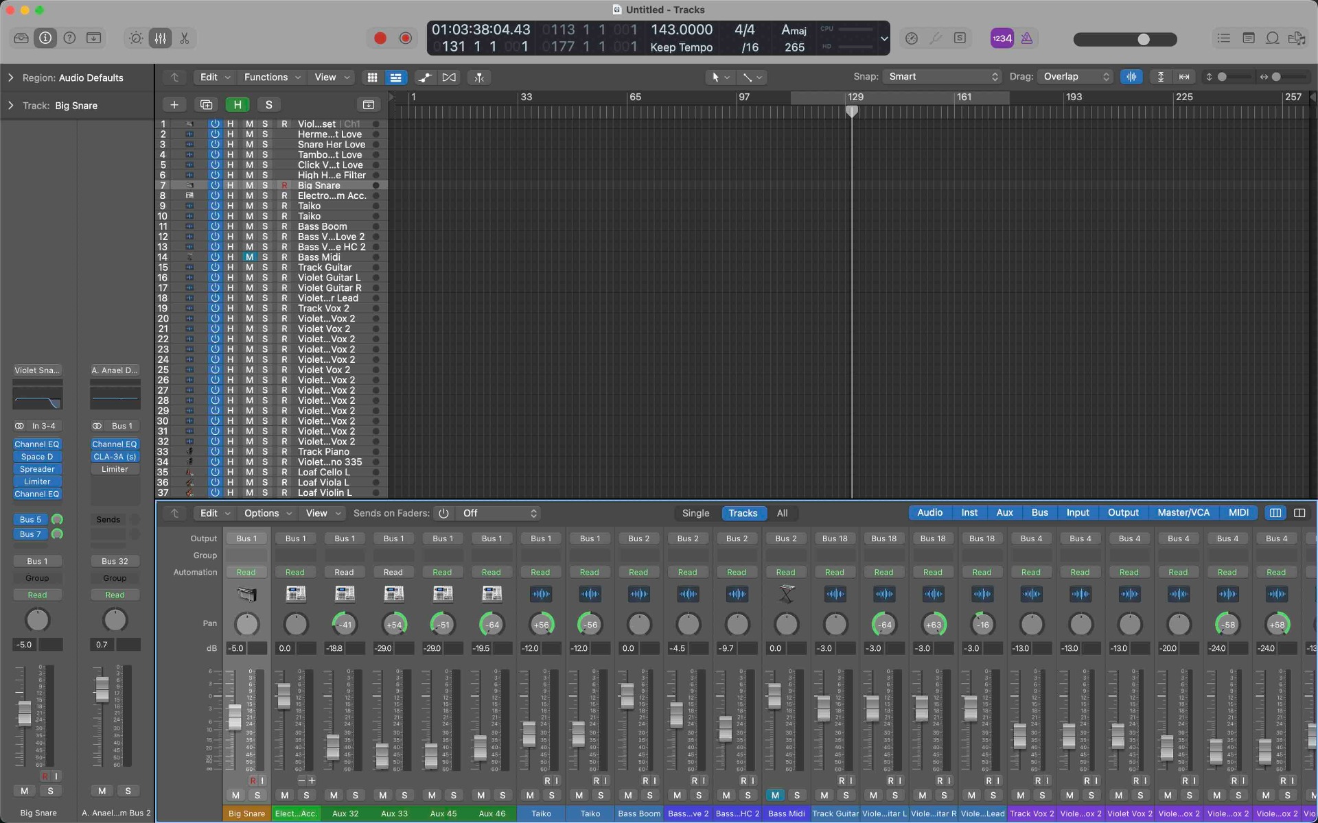 Audio design can quickly become intricate and turn into a rabbit hole of rabbit holes distracting from the actual writing process. I've run into this on multiple occasions. I have just a blank slate right here. As you can see (refer to Template), there's no audio files in here, but we have loads of tracks. And if I need to just take away as needed, I'll just take away as needed. It's easier to delete tracks than just add tracks because it takes a while to set routing up properly once busing gets involved, and busing is helpful when mixing.
