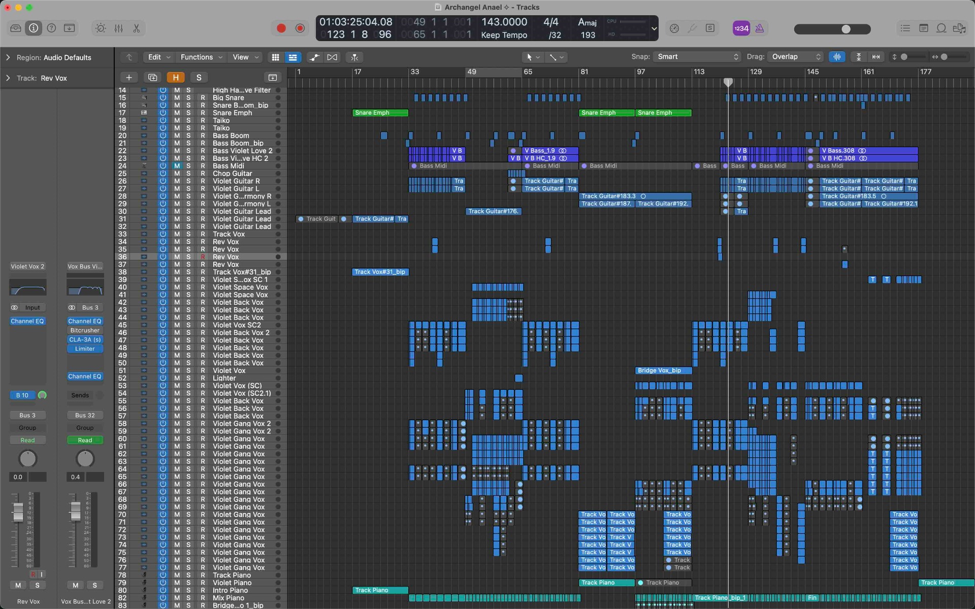 Number five here, bulk and detail. Songs can get very dense very quickly. I'd say this song is more on the denser side, which leaves less headroom in your production, a lot of layers here (refer to Project). I mean, there's a lot of muted tracks too because I've done other things to cut things out, bounce tracks for unique sonics. It's to stay true to the sound and feel that was actually there from the inspiration, not getting clouded by peripherals of the song. A guideline of the peripherals in a song is to highlight the focal point, however this is art, so the world is your oyster.